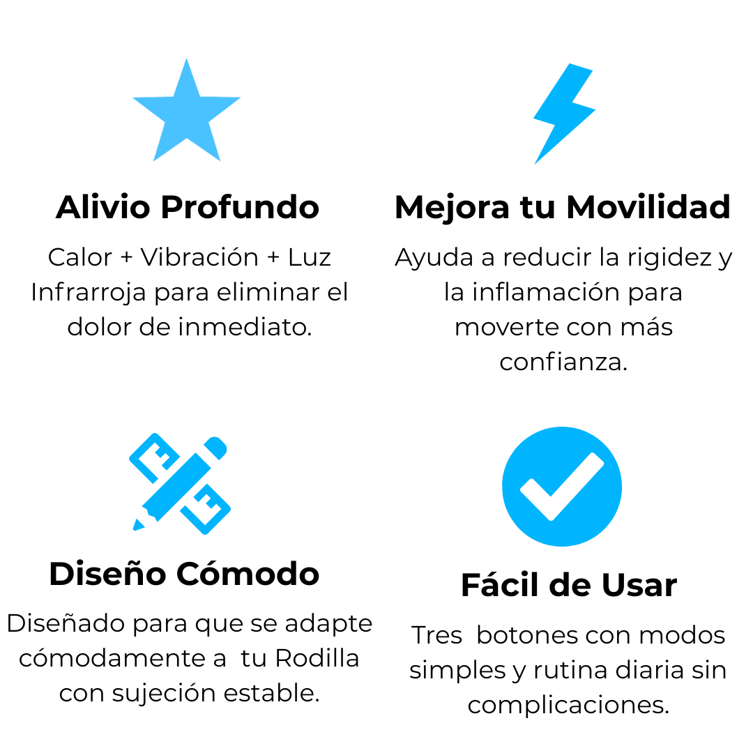 La Solución Definitiva para volver a recuperar el Bienestar diario para tus Rodillas gracias a su Innovadora Terapia 3x1: Calor Terapéutico, Vibración Potente y Luz Infrarroja.